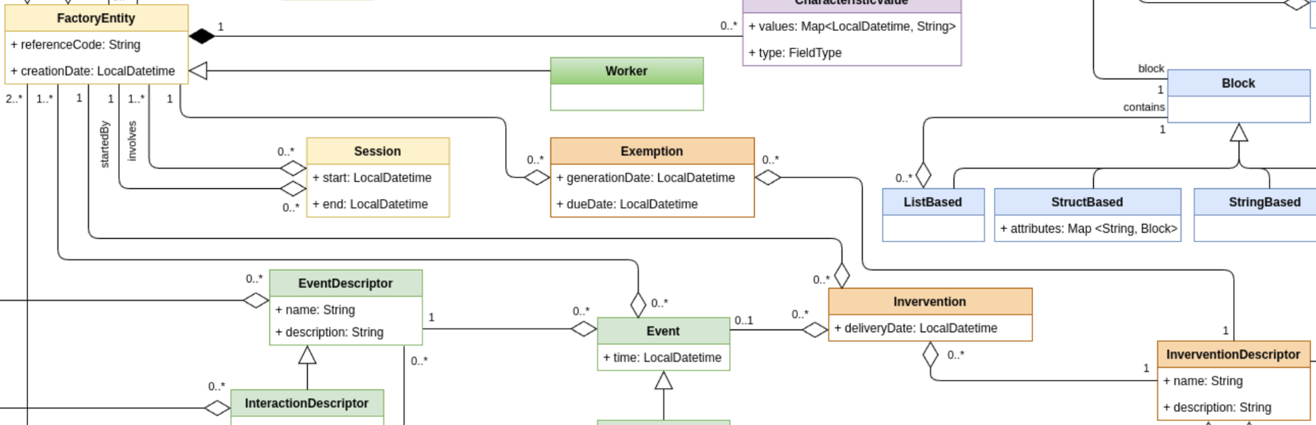 Relationship Elements (green and orange boxes): events, interactions, interventions and exemptions describe the