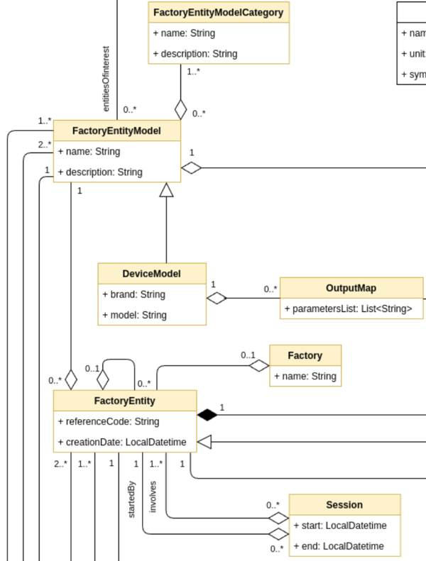 Factory Elements (yellow boxes): The factory and its components are described by a hierarchical structure. The